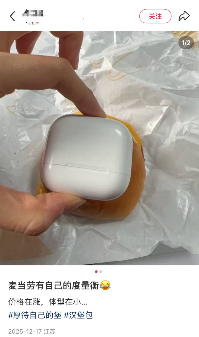 网友晒出麦当劳汉堡与耳机盒的对比图
