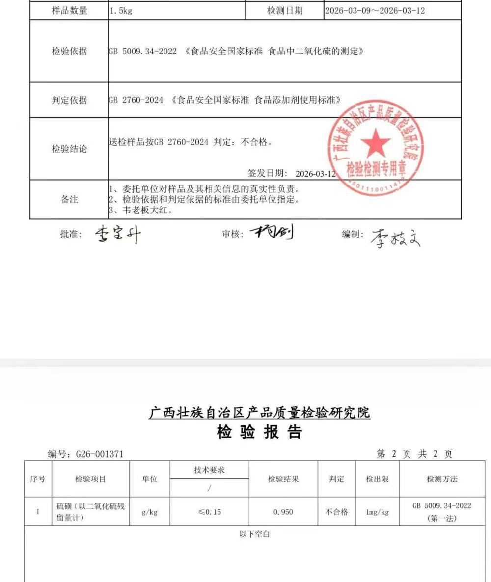 按照现行国家标准,允许硫黄熏蒸八角,但有严格的使用范围和残留限量要求。记者将在桂通香料基地和强方国际香料物流园随机走访商户获取的11份八角,送至广西壮族自治区产品质量检验研究院进行二氧化硫残留量检测。结果显示,9份样品二氧化硫残留量超标,检测结论为“不合格”。《食品安全国家标准 食品添加剂使用标准》(GB 2760-2024)明确规定,食用八角的二氧化硫最大残留限量不能超过150 mg/kg,但记者送检的样品最高残留量达950mg/kg,是国家限量要求的6倍。