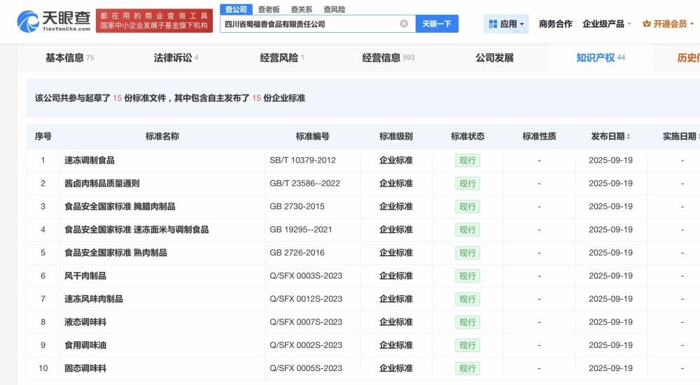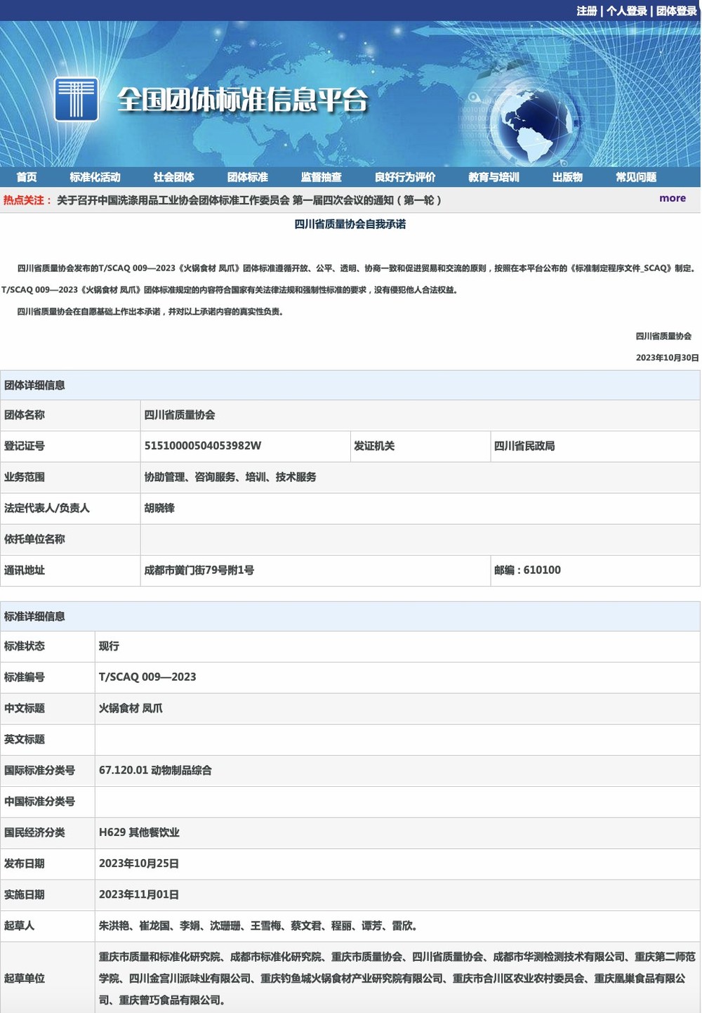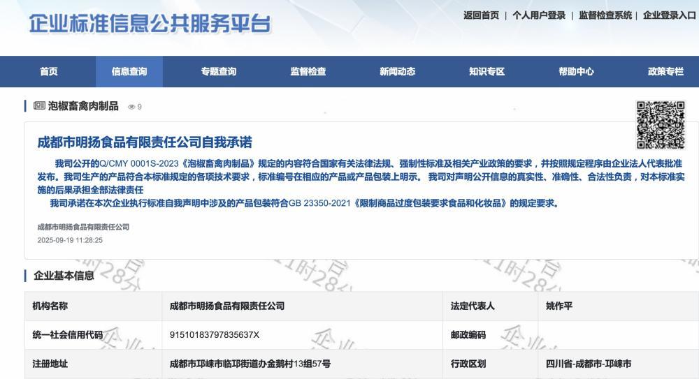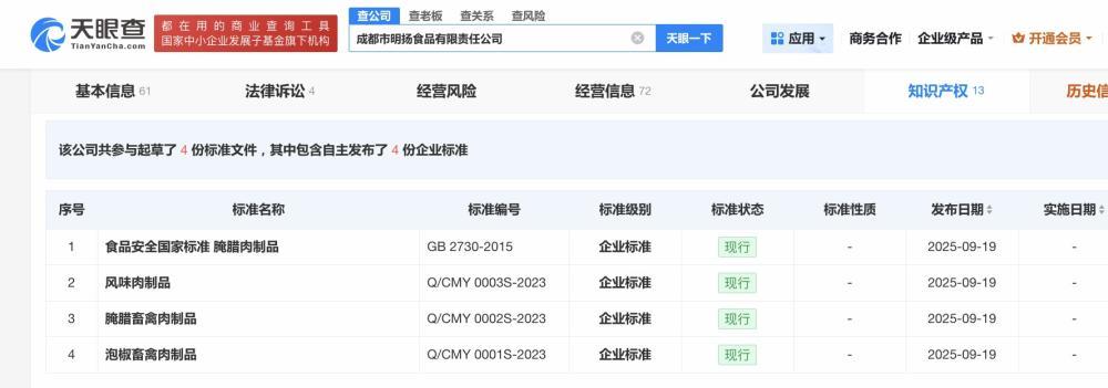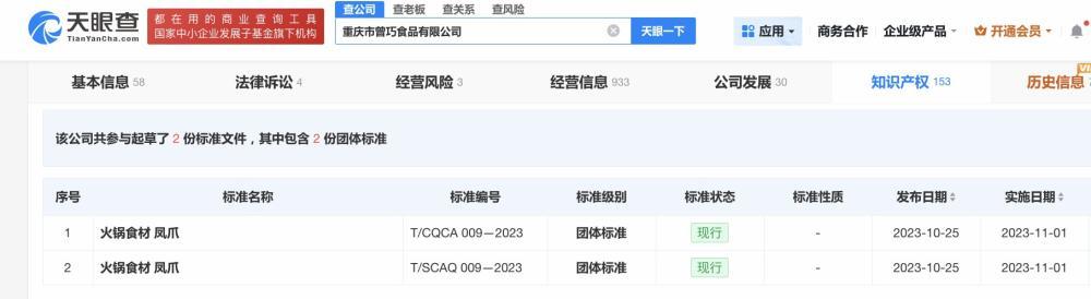 总台3·15晚会曝光漂白鸡爪,四川省蜀福香食品有限责任公司、重庆市曾巧食品有限公司、成都市明扬食品有限责任公司被点名。天眼查网站显示,这三家公司都曾参与起草标准文件。企业标准信息公共服务平台显示,2025年9月,成都市明扬食品有限责任公司曾公开泡椒畜禽肉制品相关标准。全国团体标准信息平台显示,2023年10月,四川省质量协会发布的某《火锅食材 凤爪》团体标准,重庆曾巧食品有限公司为起草单位之一。