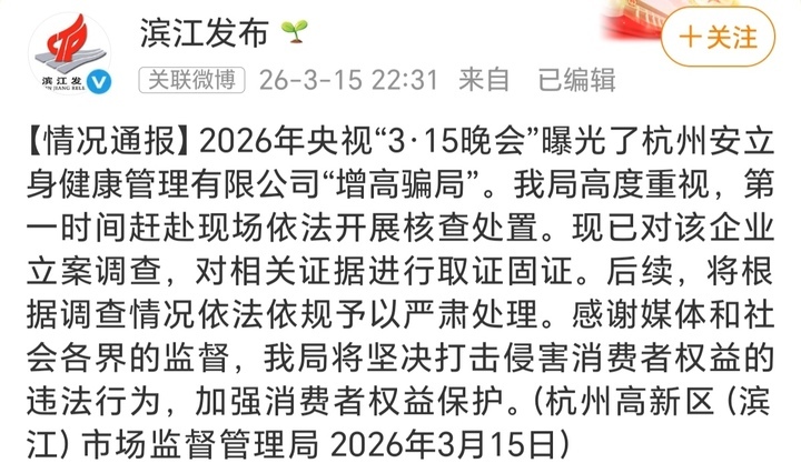 节目播出后,15日晚,杭州高新区(滨江)市场监督管理局通报:2026年央视3·15晚会曝光了杭州安立身健康管理有限公司“增高骗局”。我局高度重视,第一时间赶赴现场依法开展核查处置。现已对该企业立案调查,对相关证据进行取证固证。后续,将根据调查情况依法依规予以严肃处理。感谢媒体和社会各界的监督,我局将坚决打击侵害消费者权益的违法行为,加强消费者权益保护。