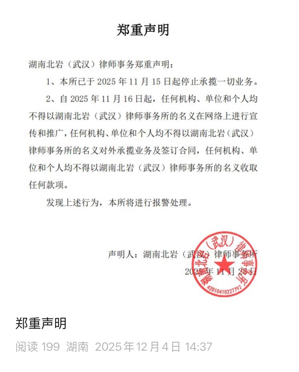 事实上,早在2025年12月4日,湖南北岩(武汉)律师事务所就通过湖南北岩律师事务所官方微信公众号发布声明称,湖南北岩(武汉)律师事务所于2025年11月15日起停止承揽一切业务。自2025年11月16日起,任何机构、单位和个人均不得以该所名义在网络上进行宣传和推广,不得以该所名义对外承揽业务及签订合同,也不得以该所名义收取任何款项。落款时间为2025年11月25日。