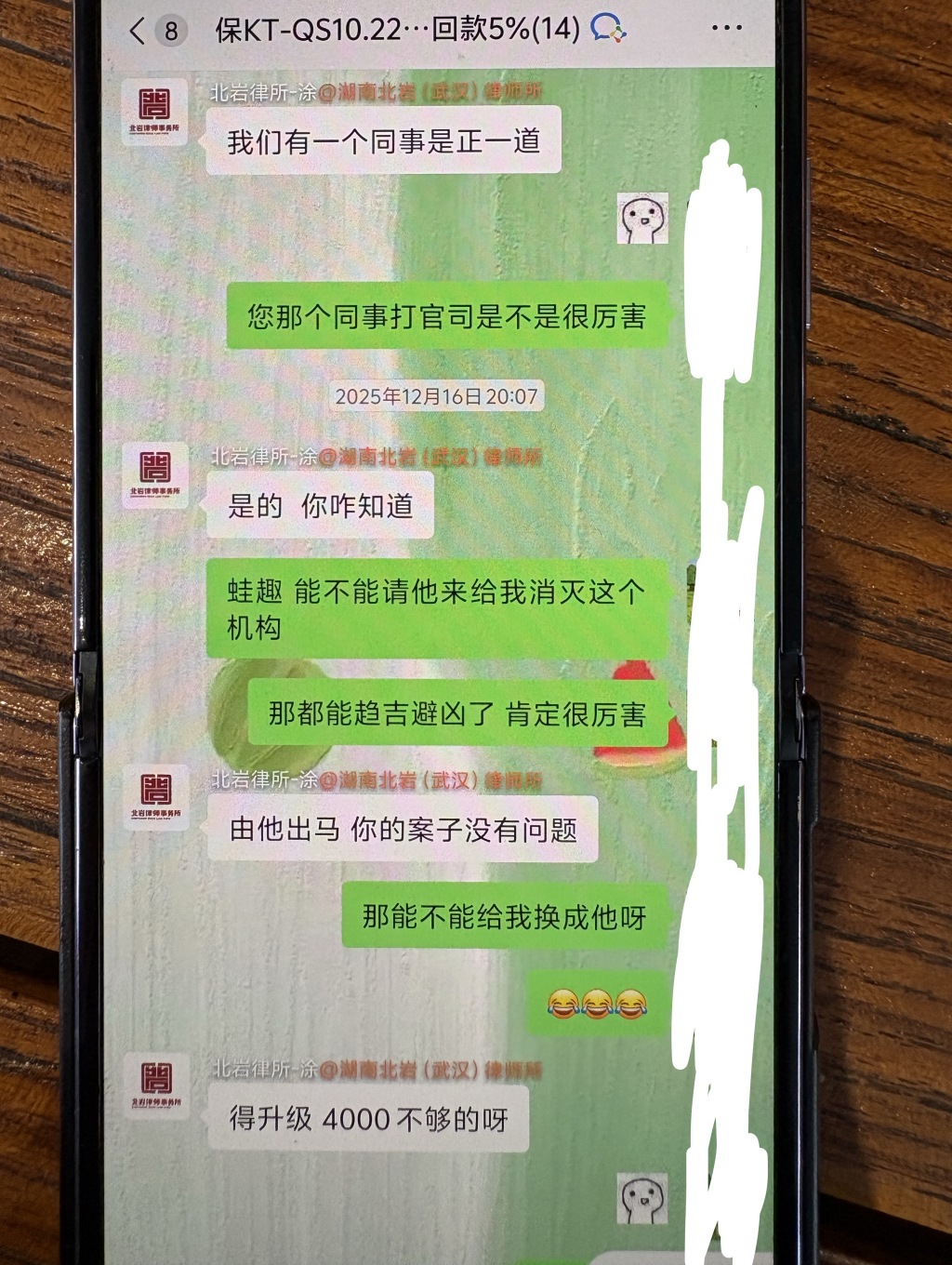 双方在群里聊天时,程桦提及自己对道教比较有兴趣,另一名助理则称“我们有个同事是正一道,由他出马你的案子没有问题。”但是律师费“得升级,4000不够的。”于是,程桦又在2025年12月16日交了2000元升级费。