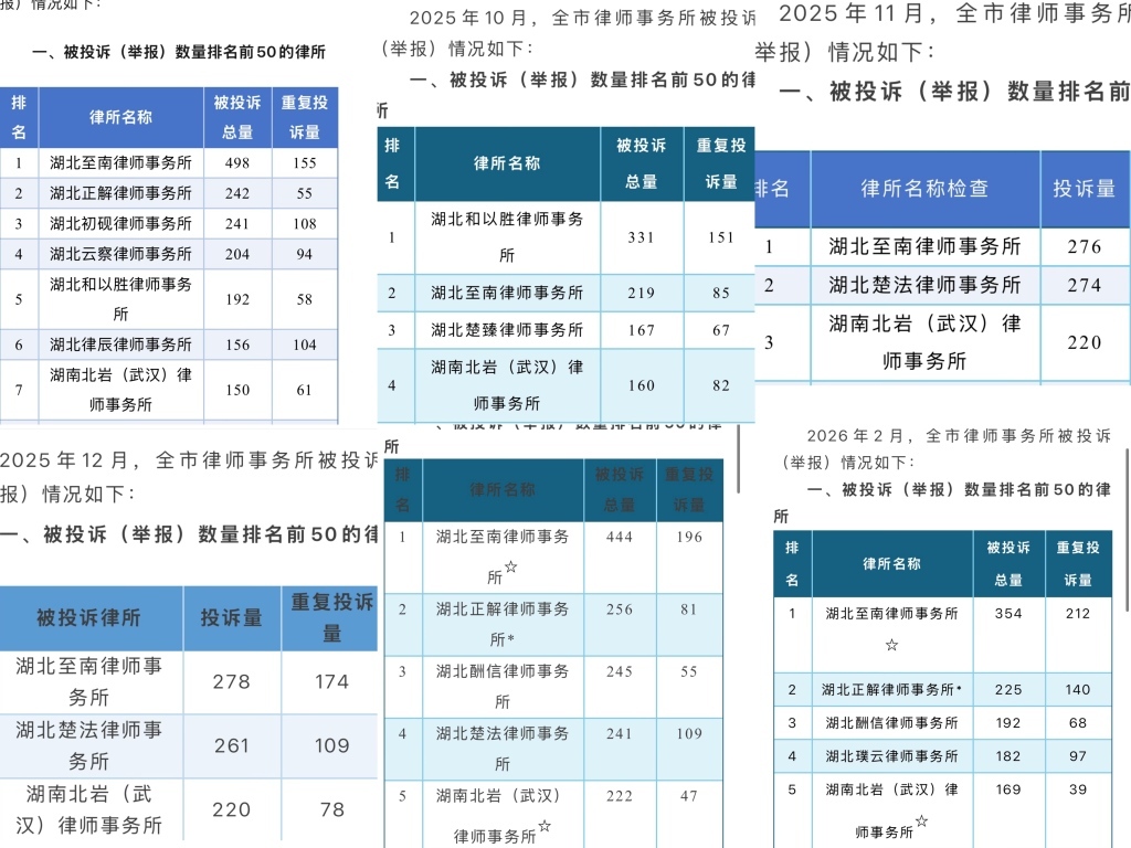 虽然该律所设立时间短、律师少,但该所的投诉量却已有数百件。武汉市律师协会从2025年9月起开始公开通报上一月全市律师行业投诉(举报)情况,湖南北岩(武汉)律师事务所于当年9月开始上榜,且是连续6个月上榜。