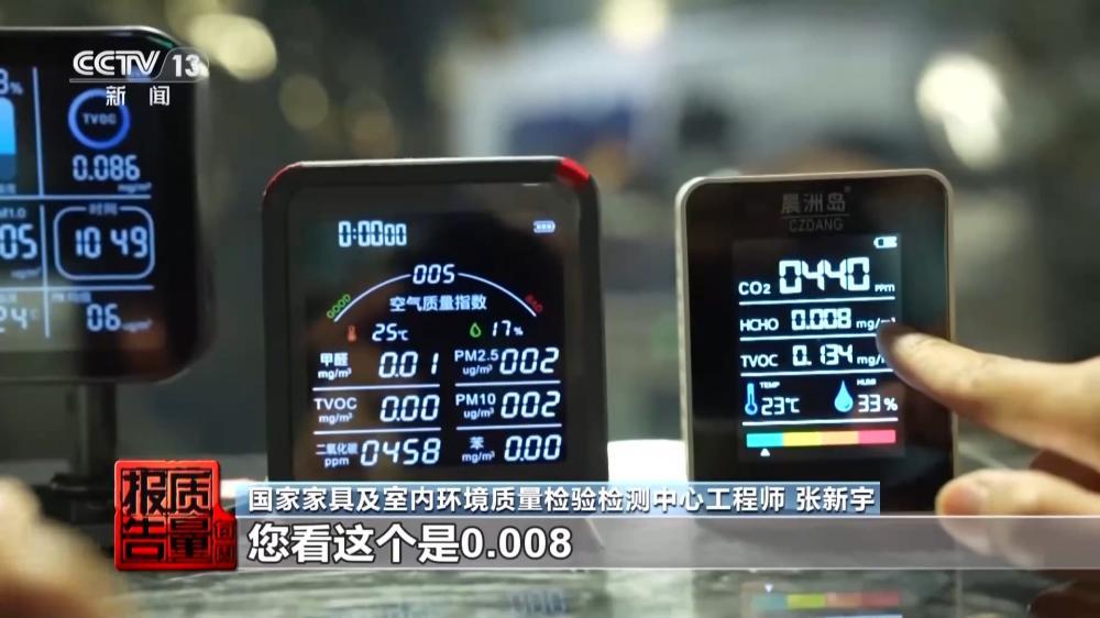 国家家具及室内环境质量检验检测中心工程师 张新宇:我们可以看到在不同品牌的便携式甲醛检测仪屏幕上显示值是不一样的,有的显示HCHO(甲醛),有的就是写甲醛。您看这个是0.008,这个是0.03,已经差了40倍了。这是0.6,这个是0.005,现在就差了将近有100倍了。