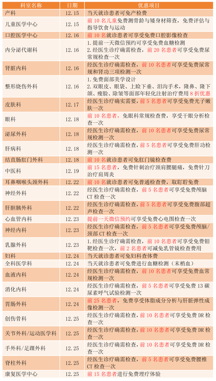 12月15日-12月26日各科室分时段推出免挂号费及专项优惠,多项健康筛查项目免费开放