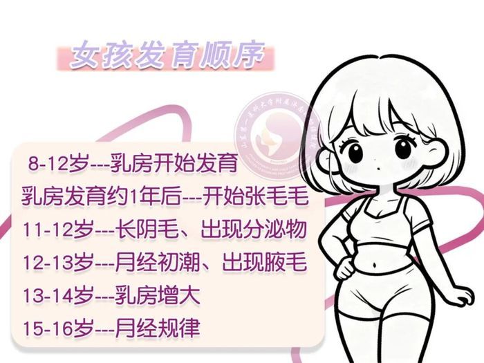 体毛出现:在乳房发育约1年后,外阴部会开始长出细软的阴毛,腋窝也可能逐渐出现腋毛,毛发会随发育变粗、变密。
