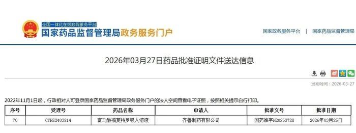 近日,据国家药品监督管理局官网公示,齐鲁制药富马酸福莫特罗吸入溶液(畅齐享®)获得批准上市,该产品主要用于慢性阻塞性肺疾病(COPD,简称慢阻肺)患者气道阻塞的维持治疗。这是齐鲁制药首个获批上市的吸入制剂产品,将为慢阻肺患者群体带来用药新选择。