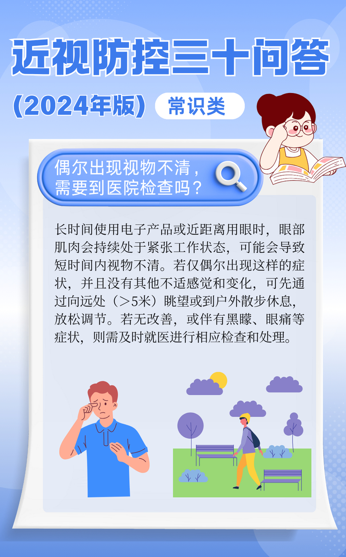 偶尔一次、非常短暂且原因明确,比如刚睡醒揉眼睛后、长时间近距离用眼(看书、看电子产品)、照明不足等会导致眼睛调节紧张,出现暂时性视物模糊、眼酸胀等可能无需过度紧张。