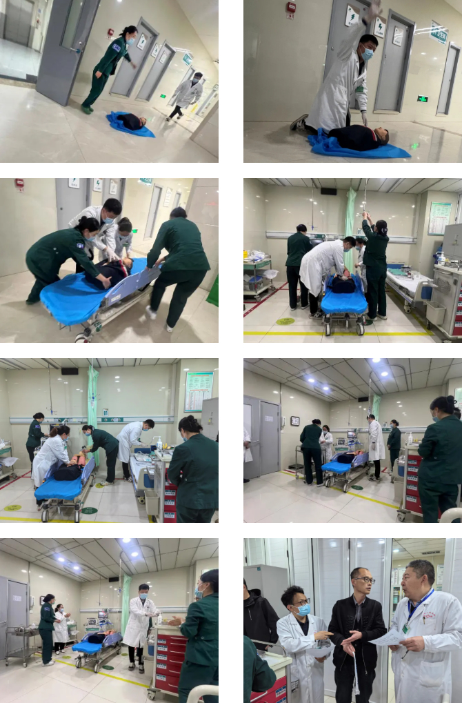 下午3点,演习有序展开。科室突发病人昏迷险情,分诊护士刘成程发现后立即启动应急预案呼叫团队支持,刘世强医师紧急响应闻声赶来,快速评估病人意识、脉搏呼吸,一边胸外心脏按压,一边组织进一步抢救。医护人员立即将心脏骤停病人转入急诊抢救室,马上进行心电检查和电除颤,并予气管插管、建立静脉通道、药物应用、血液检查等,经过紧张有序的抢救,“患者”心肺脑复苏成功,医护人员将“急性心肌梗死”病人转送介入中心进行紧急血管开通治疗。