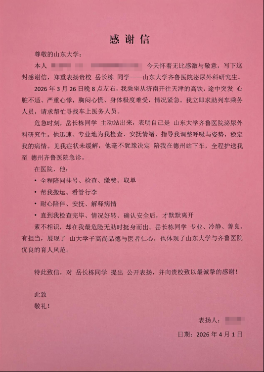 岳长栋在列车上的暖心救治行为,不仅展现了山东大学齐鲁医院学子扎实的专业医学功底,更体现了医务工作者敬佑生命、救死扶伤的职业素养与人文关怀,用实际行动诠释了新时代医学生的使命与担当。