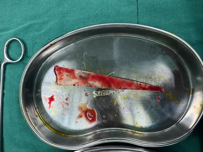 为最大限度保障患者安全,胸心外科、麻醉科等多学科专家开展术前会诊,精准制定手术方案,完善各项应急抢救预案。在充分做好术前准备后,急诊手术即刻开展。手术过程中,胸外科手术团队吕玉明主任医师、马辛副主任医师、解西菁主治医师凭借丰富的临床经验和精湛的手术技巧,在麻醉科团队的全程监护保障下,谨慎分离胸腔内粘连组织,仔细避开重要血管、神经和肺脏组织,精准定位胸腔内玻璃异物,小心翼翼地将异物完整取出,同时妥善处理受损组织,严密止血、修补创伤,全程操作精准细致,全力避免各类手术风险。
