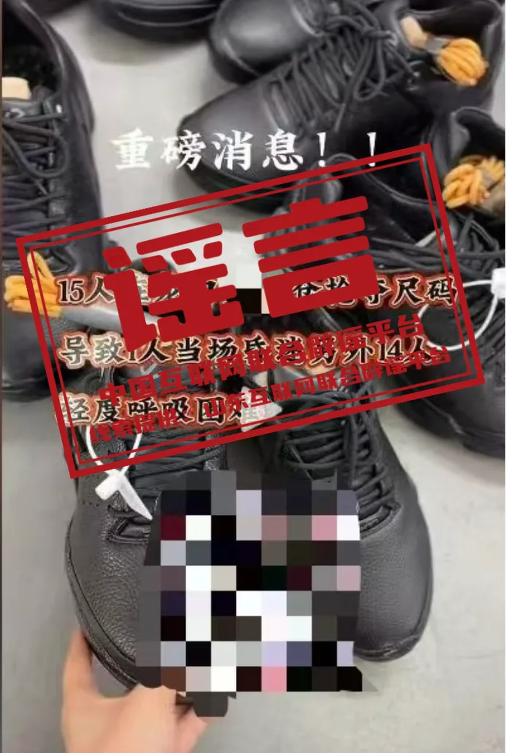 真相:近日,有网民在某平台上发布视频称:“重磅消息!!15人在龙口某仓库抢夺尺码,导致1人当场昏迷,另外14人轻度呼吸困难,天降之祸”,引发社会关注。山东龙口网信部门巡查发现该情况后立即联合当地公安部门启动调查程序。调查发现,此视频发布者系当地品牌运动折扣店店主刘某。图中“抢夺尺码”是指断码甩卖的鞋子,有时商家为吸引顾客会搞类似的优惠活动。而刘某为博取流量,吸引关注,自行编造并发布了上述谣言。目前,龙口公安已依法对刘某进行行政处罚。(来源:山东互联网联合辟谣平台)