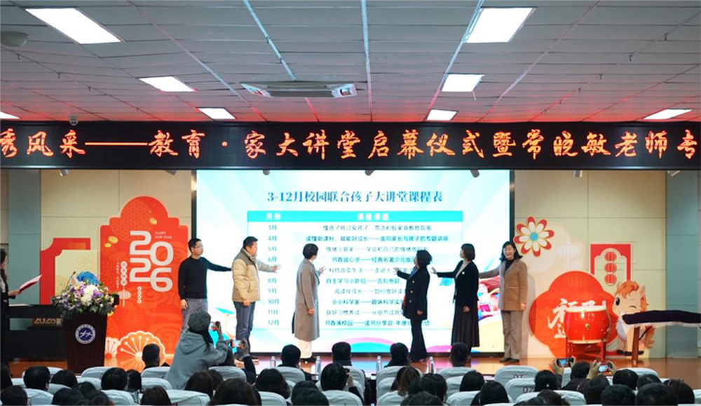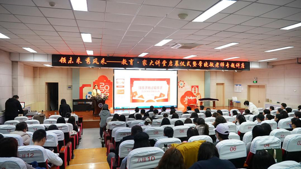 育秀中学、育秀中学小学部、育秀小学、泉秀学校、泉秀学校小学部及望岳路小学六位校长共同登台,联合发布大讲堂全年课程规划,明确3月到12月六校将联合山东教育出版社轮动开展学科学习、心理健康、亲子沟通等主题讲座,把优质教育指导精准送到家长身边。