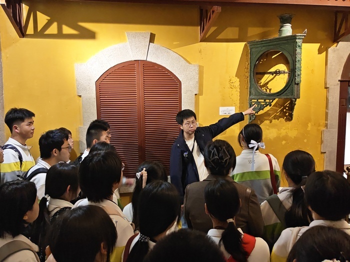 步入展厅,一件件珍贵的历史实物令师生们驻足凝视。最古老的实物之一——1900年德国公司制造的钢轨与燕尾形钢枕,重达50公斤,是胶济铁路作为殖民铁路的“铁证”,见证着那段屈辱与觉醒并存的历史。来自青岛大港火车站的三面钟,设计精巧,三面表盘共用同一机芯,方便乘客和工作人员同时看时间,展现了早期铁路设施的匠心智慧。而原济南站大钟表盘残件,则承载着更为沧桑的记忆——1992年,被誉为“远东第一站”的津浦铁路济南站被拆除,这座钟楼构件随之流失,后经辗转周折寻得大钟表盘残件,如今成为老站风貌的重要遗存,默默诉说着城市变迁与铁路发展的兴衰荣辱。