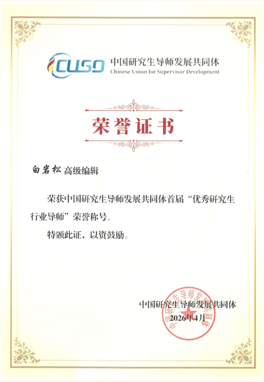 据中国传媒大学研究生院微信公众号消息,中传评选推荐的新闻学院专业学位研究生行业导师、著名新闻主持人白岩松老师荣获“优秀研究生行业导师”称号。这是中国研究生导师发展共同体首次进行评选,全国共有40人获此称号。