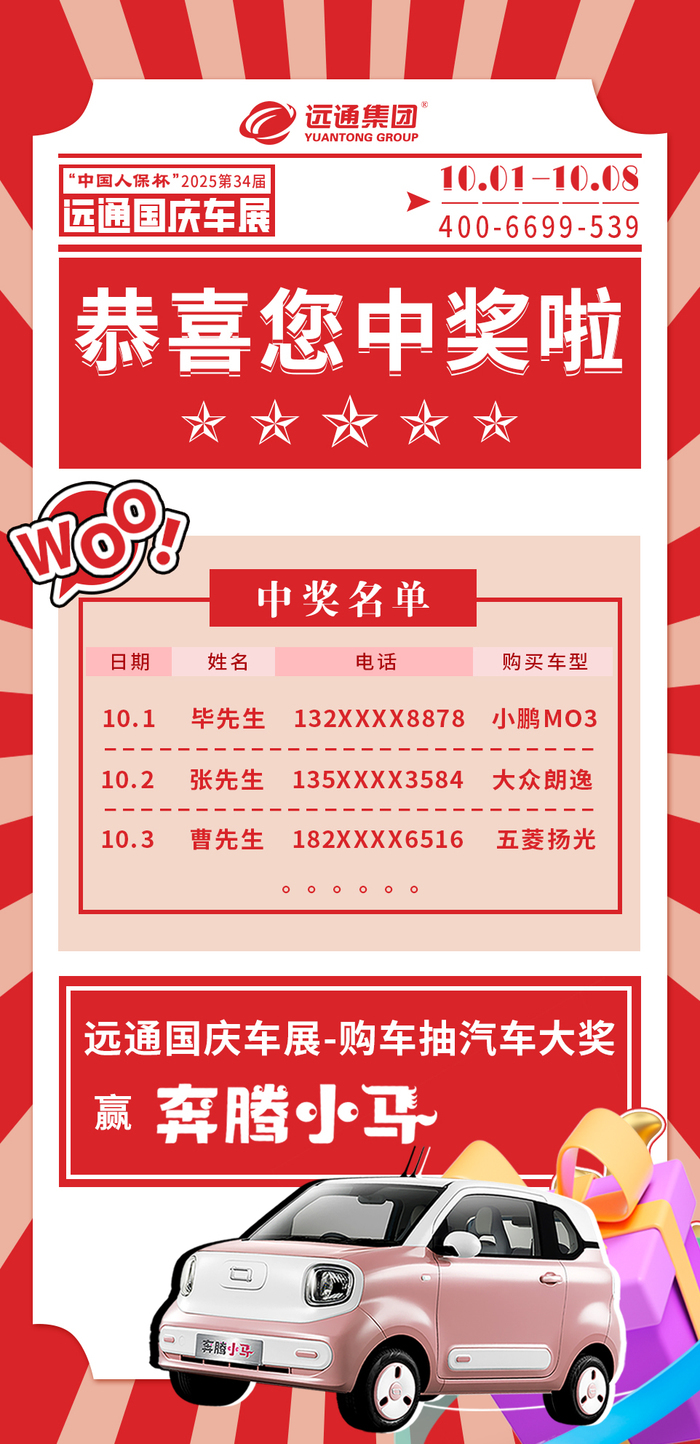 10月1日—8日,远通国庆车展正式上演,车展期间购车,还可参与抽汽车大奖,连抽8天,目前已有多位幸运车主中了大奖——奔腾小马,车展期间每日1台。