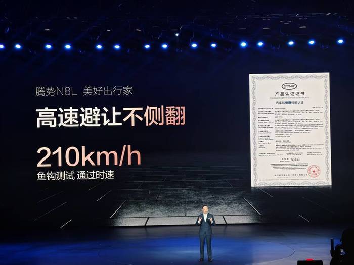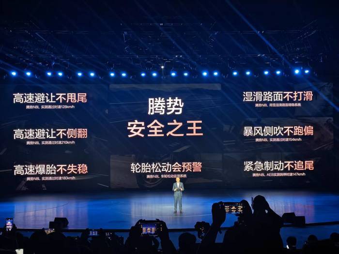 当晚,在发布会现场,比亚迪向大众演示了一组包括碰撞测试、高速爆胎、高速避让及暴风极端天气等多种“极限”安全测试,最终实验结果表明,腾势N8L实现了180km/h高速爆胎不失稳、150km/h横风侧吹不跑偏、128km/h高速避让不甩尾以及93.6km/h的麋鹿测试成绩。