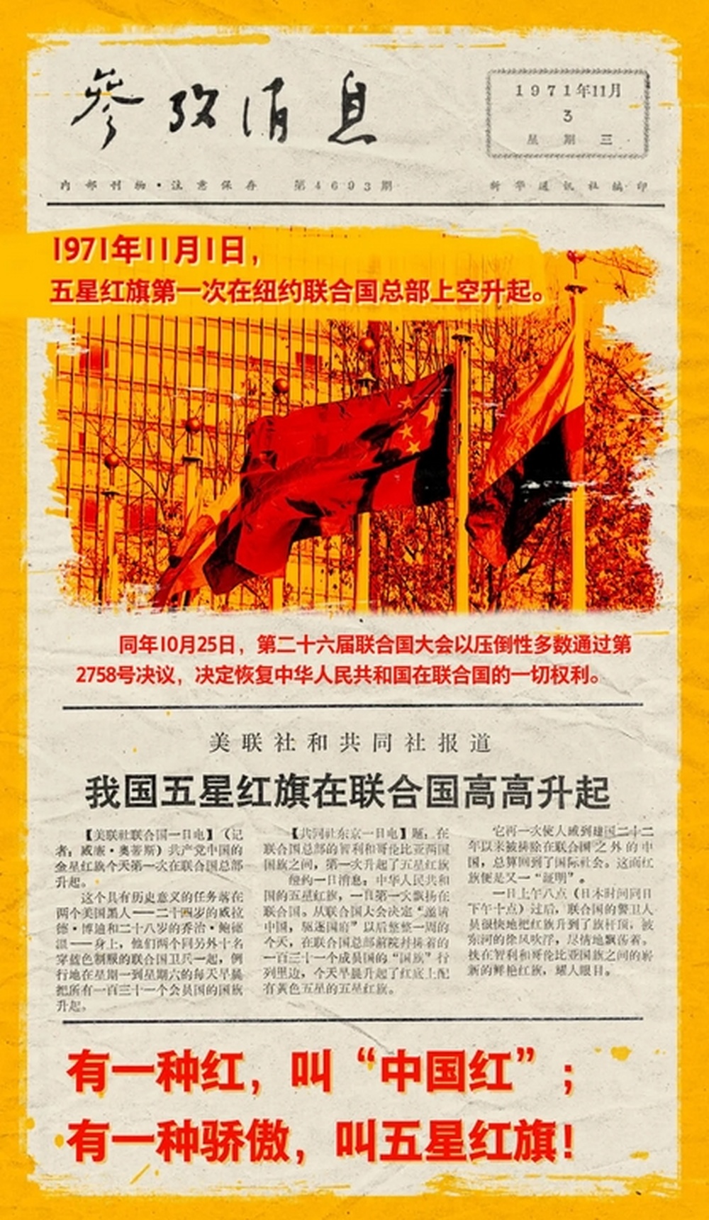 1971年11月1日,五星红旗第一次在纽约联合国总部上空飘扬。(联合国官网)