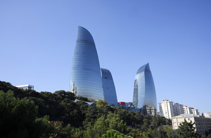 这是2024年11月1日拍摄的阿塞拜疆巴库地标建筑之一——“火焰塔”。新华社发(托菲克·巴巴耶夫摄)