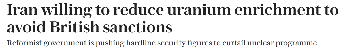 在伊朗与欧洲三国新一轮对话开始前,英国媒体报道称,伊朗有可能降低铀浓缩丰度,以换取欧洲三国放弃启动“快速恢复制裁”机制。