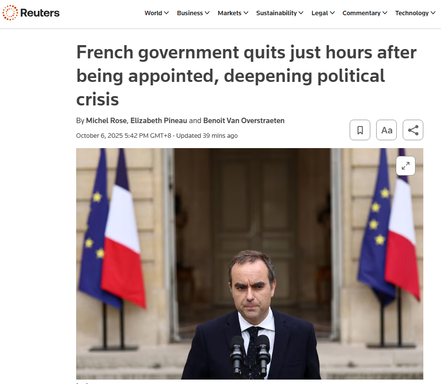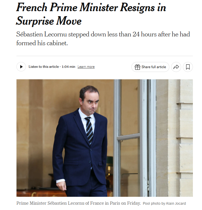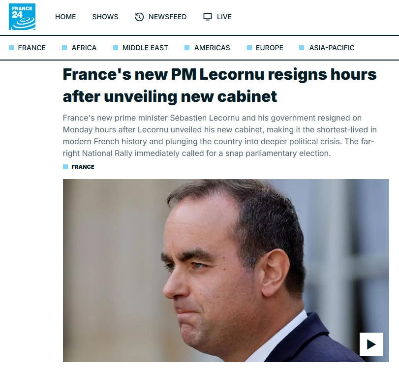 多家外媒称,勒科尔尼辞职“出乎意料”,此举也创下法国现代史上政府存续时间最短纪录。