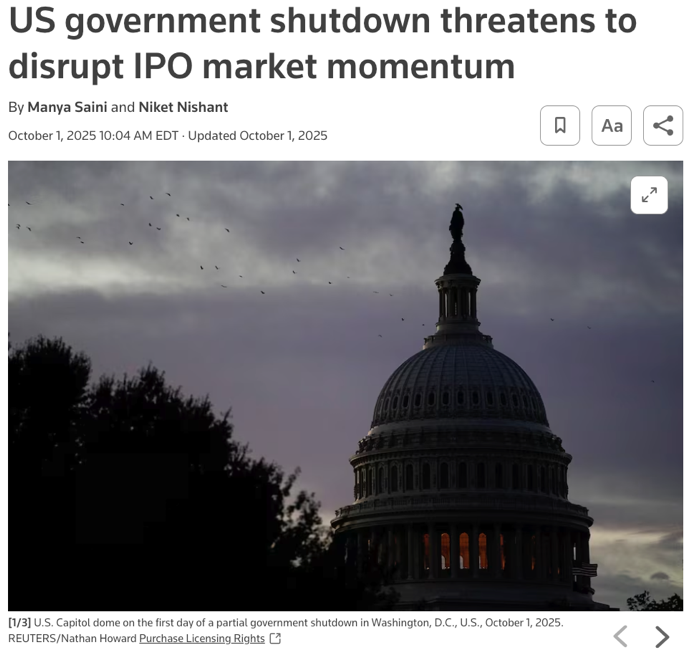 路透社报道,政府关门导致证券交易委员会关闭,IPO文书处理暂停,这无疑将影响市场情绪