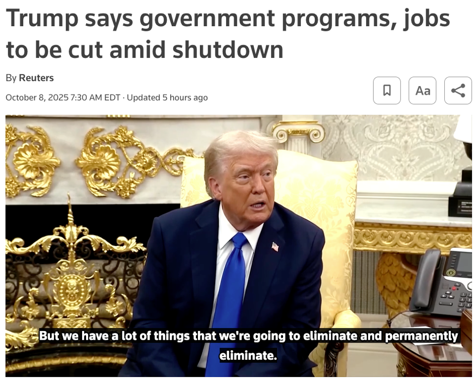 路透社报道,特朗普10月7日表示,由于政府持续“停摆”,白宫计划取消一些政府项目,他将在未来几天公布裁员细节。