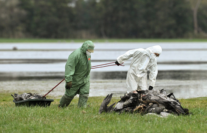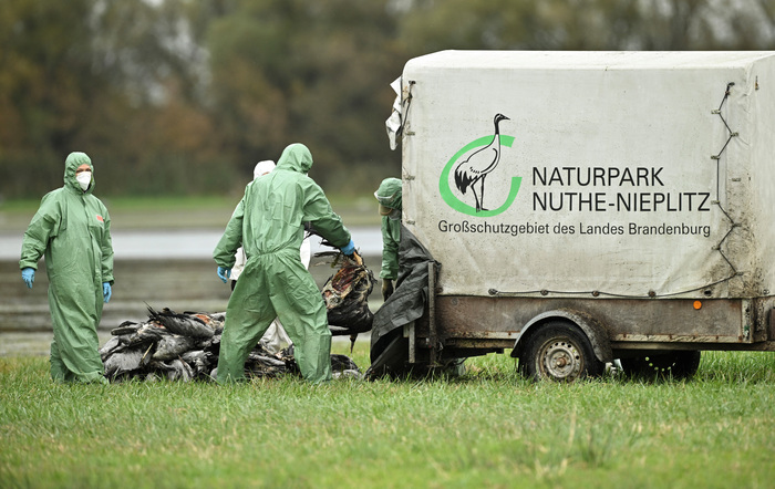10月22日,在德国利努姆,身穿防护服的工作人员转移因禽流感死亡的鹤。 据路透社报道,利努姆附近一处南迁候鸟栖息地近日发生禽流感疫情。 新华社/路透