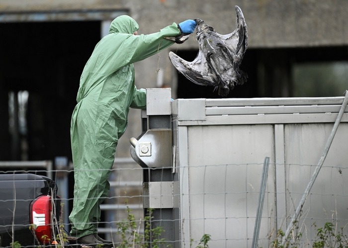 10月22日,在德国利努姆,一名身穿防护服的工作人员将因禽流感死亡的鹤装车。 据路透社报道,利努姆附近一处南迁候鸟栖息地近日发生禽流感疫情。 新华社/路透