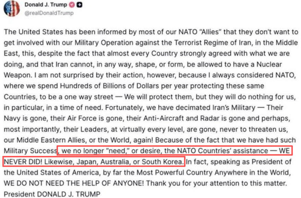 特朗普在文中明确写道:“他们(北约)不会为美国做任何事,尤其是在美国有求于他们的时候。”在文末,特朗普还提及对日本、澳大利亚以及韩国“情况亦是如此”。特朗普强调,他作为美国总统郑重声明:“我们根本不需要任何人的帮助。”