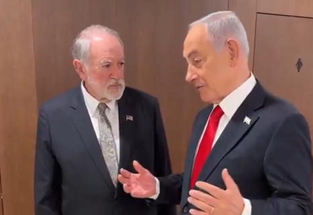 △以总理内塔尼亚胡社交媒体账号17日公布视频截图,内容为内塔尼亚胡会见美国驻以色列大使迈克·赫卡比。