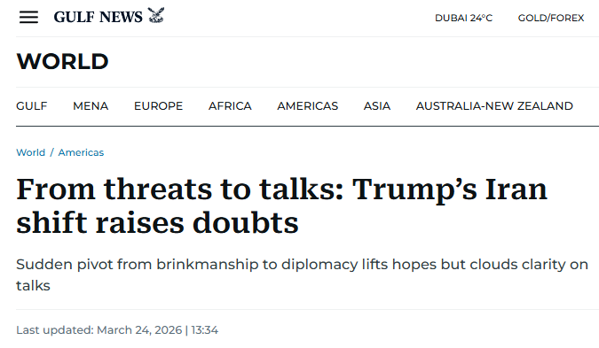 《海湾时报》的一篇报道提到,分析人士表示,美国总统这种转变符合一种熟悉的模式,他经常将全面的威胁与最后通牒结合起来,但后来又突然转变——这种循环一再扰乱全球市场。