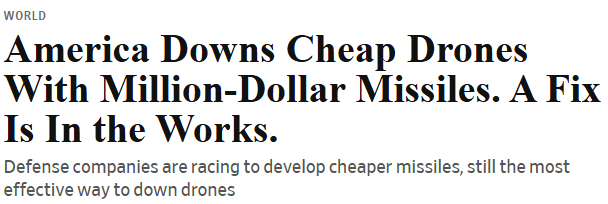 成本不对称:据《华尔街日报》报道,美军必须用价值数百万美元的防空导弹拦截成本不到十万美元的伊朗无人机,高成本对低投入的消耗战正在加剧财政与军事压力。