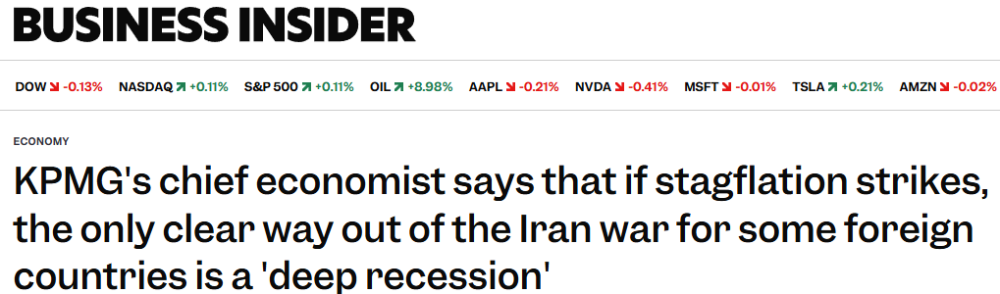 美国总统特朗普发表“胜利讲话”后,投资者和分析人士并未给予积极回应。多数人认为军事行动对霍尔木兹海峡等关键航道的威胁仍在,并影响全球能源和商品市场,造成经济增长与通胀之间的压力传导。毕马威(KPMG)首席经济学家黛安·斯旺克警告,美伊战争引发多重供应冲击,推动全球滞胀风险上升,深度衰退可能成为全球经济的唯一出路。