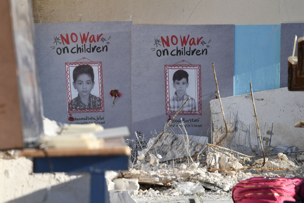 4月6日,在伊朗首都德黑兰市举行的悼念活动现场,组织者搭建起小学教室遭袭场景并摆放学生书包,悼念遭美以空袭遇难的米纳卜小学学生。新华社记者沙达提摄