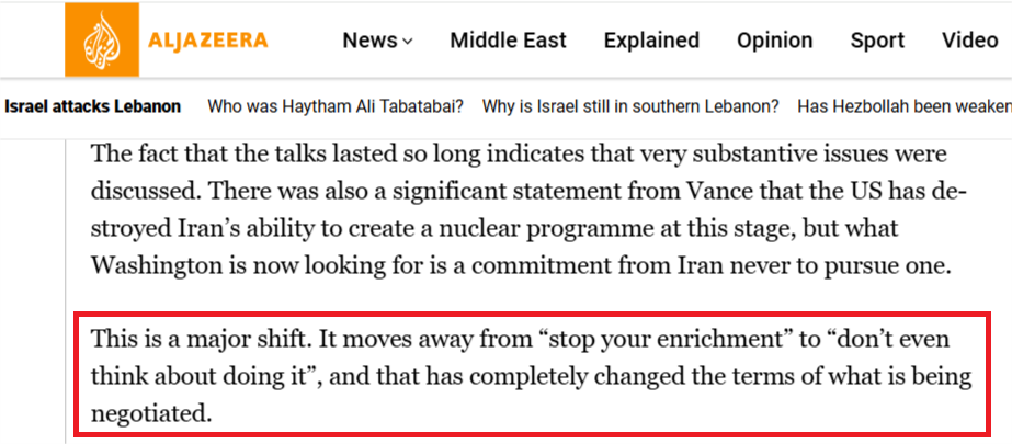 对此,半岛电视台12日的报道指出,谈判持续了很长时间,表明双方讨论了非常实质性的议题。但万斯在新闻发布会上的简短发言中表示,华盛顿现在寻求的是伊朗作出承诺——永远不寻求拥有核武器。报道指出,这是一个重大转变。它标志着美方谈判条件已从要求伊朗“停止铀浓缩活动”转变为“根本不要有这方面的念头”,这完全改变了谈判的性质。