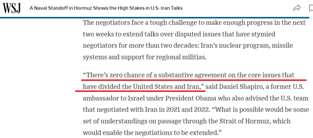 文章说,双方谈判代表面临艰巨挑战,必须在接下来的两周内取得足够进展,以便就那些困扰谈判方二十多年之久的争议性问题继续展开会谈。文章引用曾担任驻以色列大使的资深美国外交官和中东问题专家丹尼尔·夏皮罗的话指出,“在长期分裂美国与伊朗的核心议题上,达成实质性协议的可能性为零”,文章因此将此次谈判形容为“希望渺茫的和平努力”。