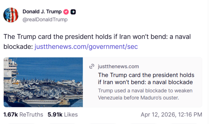 随着美伊谈判陷入停滞,外界目光重新聚焦美国总统特朗普。截至目前,特朗普尚未就此作出公开表态。不过美东时间12日凌晨,特朗普在社交媒体上转发了一篇“海军封锁”伊朗的文章。