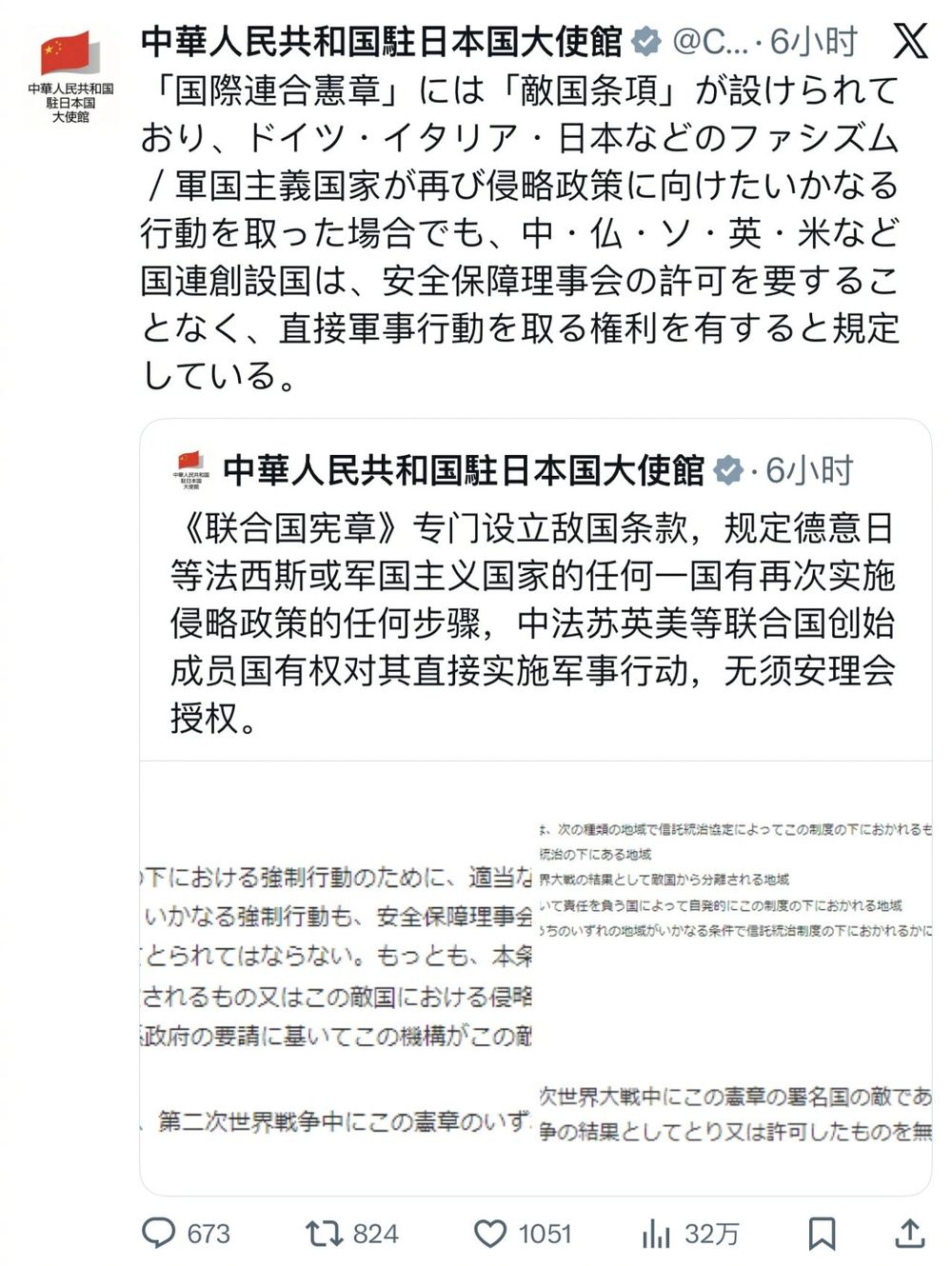 21日,中国驻日大使馆在社交平台X用中日双语发帖:《联合国宪章》专门设立敌国条款,规定德、意、日等法西斯或军国主义国家的任何一国有再次实施侵略政策的任何步骤,中、法、苏、英、美等联合国创始成员国有权对其直接实施军事行动,无须安理会授权。