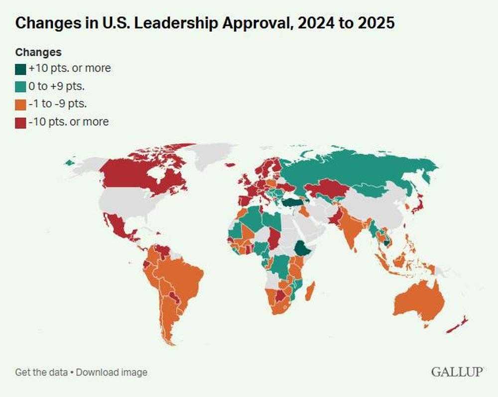 报告称,在过去一年里,美国支持率在44国骤降超10个百分点,仅7国出现相似增幅。在北约盟国的跌幅尤为显著:德国、葡萄牙、加拿大、英国、意大利均大幅下滑。而以色列成为例外,支持率反弹至76%。有23个国家对中国领导力的满意度提高超过10%。