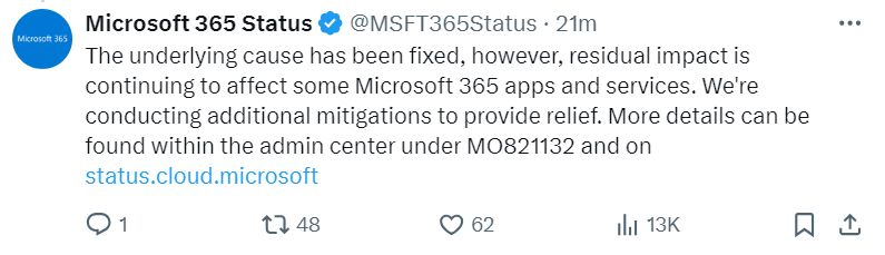 7月19日晚间,微软称根本问题已经得到解决。官方账号Microsoft 365 Status在X(原推特)平台上发文写道:“根本原因已得到修复,但残余影响仍在继续影响一些Microsoft 365应用和服务。我们正在采取额外的缓解措施以提供帮助。”