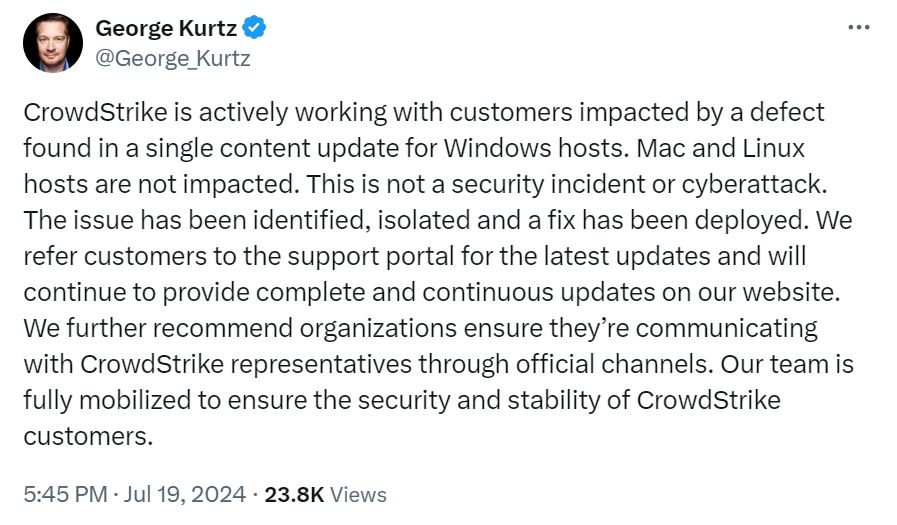 CrowdStrike的CEO乔治·库尔茨的回应。来源:X平台