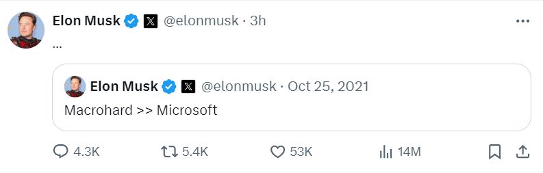 对于此次事件,热爱“吃瓜”的特斯拉CEO埃隆·马斯克(Elon Musk)先在X平台上转发了网友夸赞X平台未受影响的图片,又转发了其在2021年10月25日拿微软名字开玩笑的推文“Macrohard>>Microsoft”,并评论“…”。