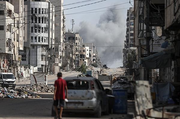 9月28日,加沙城一座建筑遭以军空袭后冒出浓烟。新华社/美联