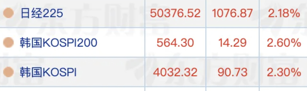 10月27日上午,全球股市总体表现强势。其中,日韩股市高开高走,截至发稿,日经225指数、韩国KOSPI200指数、韩国KOSPI指数涨幅均超过2%,且均刷新历史高点,日经225指数站上50000点。详情>>