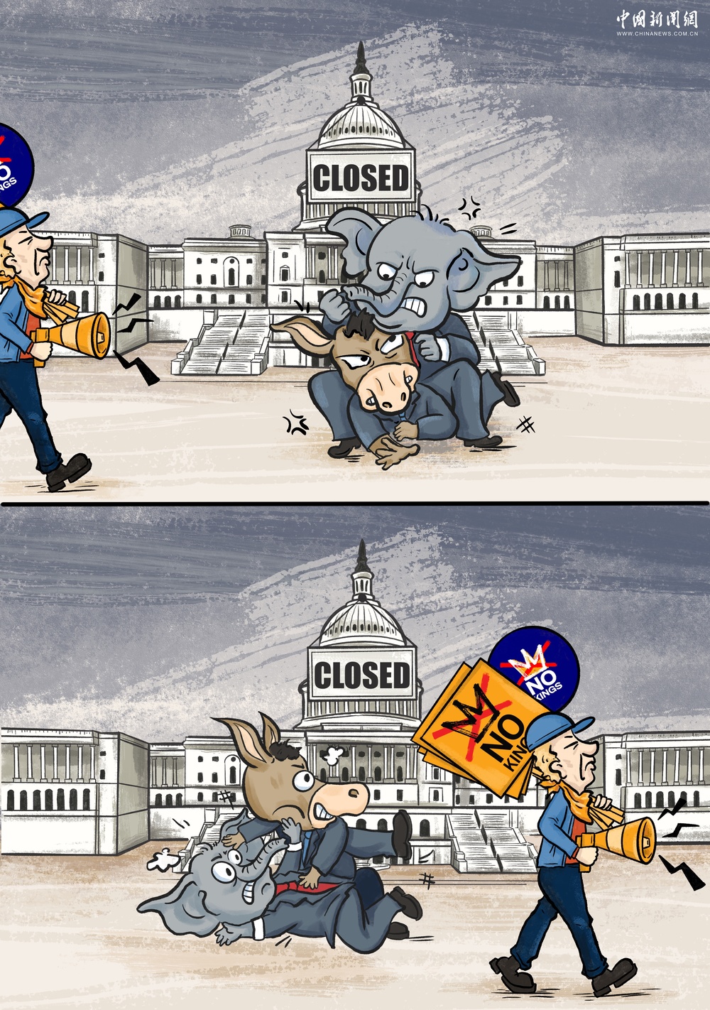 当举着“No Kings”标语的民众漠然路过时,争斗中的驴与象似乎才短暂地停下,惊觉真正的议题早已不是彼此间的胜负——而是那扇高悬着“关门”牌子、对沸腾民意关闭的联邦政府大门。