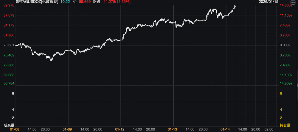 金属价格的飙升还在继续。1月14日亚洲交易时间,现货白银(伦敦银现)首次突破90美元/盎司,截至发稿时涨3.25%,报89.745美元/盎司。COMEX白银期货报89.535美元/盎司,涨3.7%。详情>>