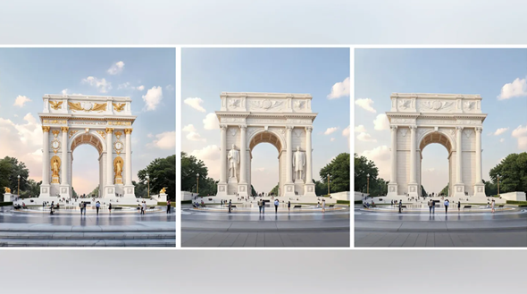 报道提到,特朗普去年年底就公开讨论过相关构想,当时他说,为纪念美国独立250周年而建造一座凯旋门式纪念碑的工程可能在两个月内开始。他今年1月23日在其自创社交平台上分享了一系列古典凯旋门效果图,引发新一轮猜测。这些图片展示了多种设计方案,其灵感来源于法国巴黎凯旋门等欧洲古典风格拱门,以巨型柱体、宽阔中央开口和华丽细节为特色。