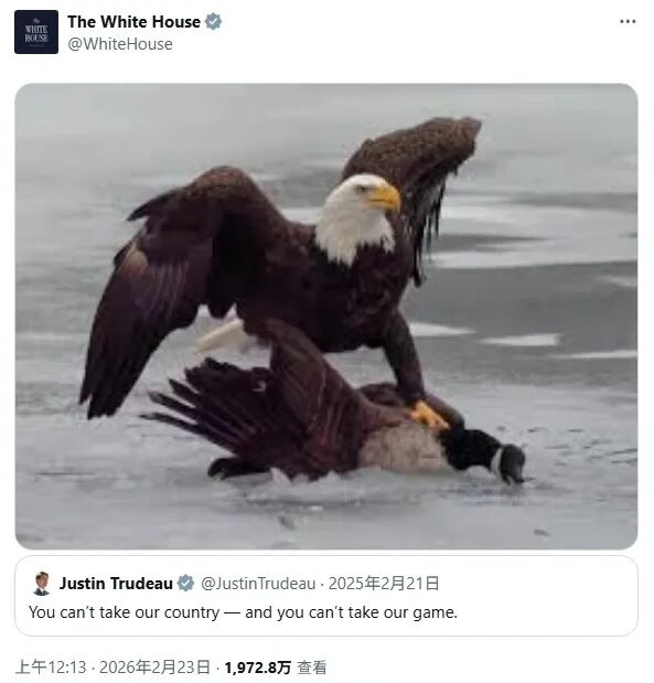 报道还称,为了强调美国的胜利,白宫发布了一张显示白头鹰猛扑加拿大鹅的照片,回应一年前时任加拿大总理特鲁多在社交平台X上发布的一条帖子。特鲁多在帖子中写道:“你们夺不走我们的国家——也夺不走我们的国球。”