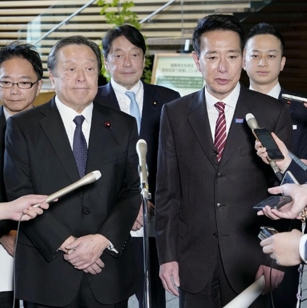 6日,自民党议员滨田康和和日本维新党议员前原诚二在首相官邸会见高市早苗后,回答记者提问。